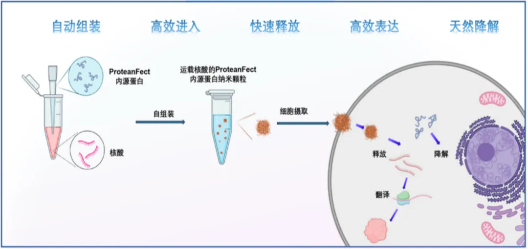 基于凝聚体原理,西湖凝聚体联合西湖大学开发了 ProteanFect 蛋白分子,能够在体外与核酸自组装成高度规律的球体结构,形成蛋白纳米颗粒。这种自组装而成的ProteanFect-核酸复合物能够: