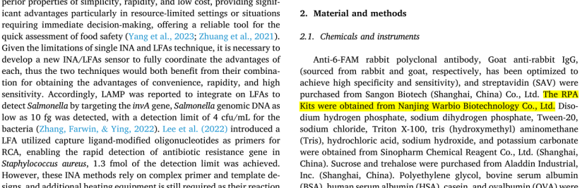 其中,使用了沃博生物warbio的产品,DNA恒温快速扩增试剂盒(DNA试纸条型),货号B8203C5.