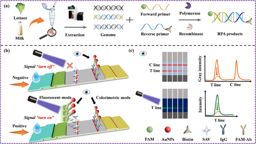 本研究由江南大学团队开发了一种便携式、基于重组酶聚合酶扩增(RPA)技术的双模式(比色/荧光)侧流层析试纸条传感器,用于在生菜和牛奶样本中实现沙门氏菌的现场即时检测。