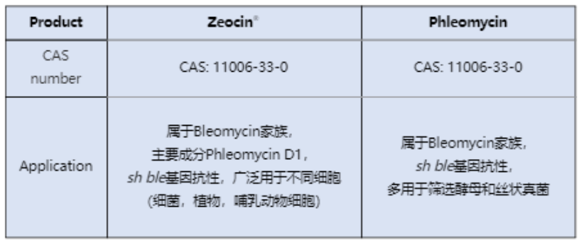 虽然Bleomycin、Phleomycin、Zeocin®为同一家族成员,但要注意Zeocin®和Phleomycin不能替代Bleomycin。Zeocin®和Phleomycin的CAS号是一样的,因为两者主要功能成分是一样的,均为Phleomycin D1。Zeocin®由于添加了不同的辅料,更适用于哺乳动物细胞的筛选。