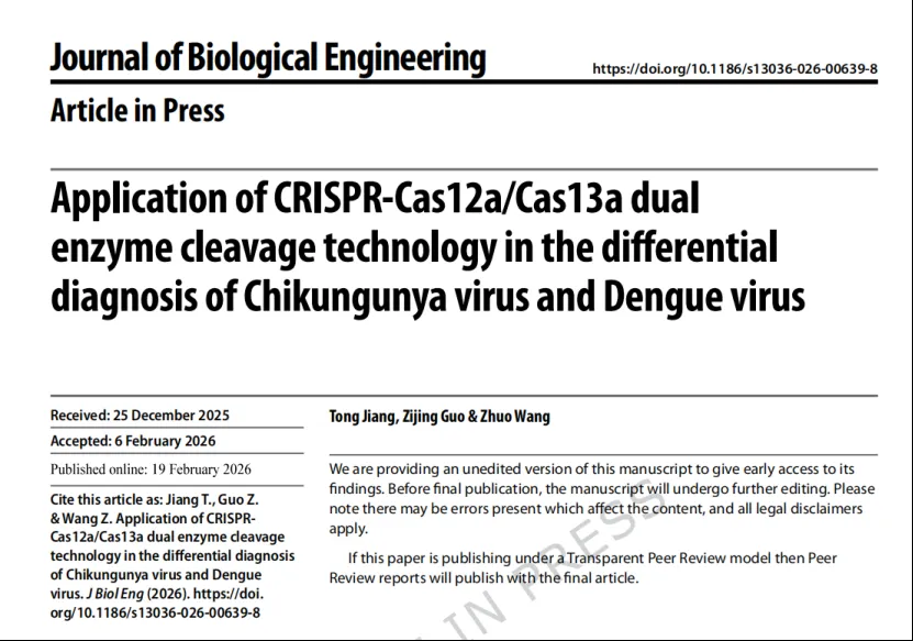 今天跟大家分享一篇近期发表在《Journal of Biological Engineering》上的前沿研究,它成功地用CRISPR-Cas12a/Cas13a双酶技术,实现了基孔肯雅热病毒和登革病毒的快速、精准“双检”,为虫媒病毒诊断带来了新突破。