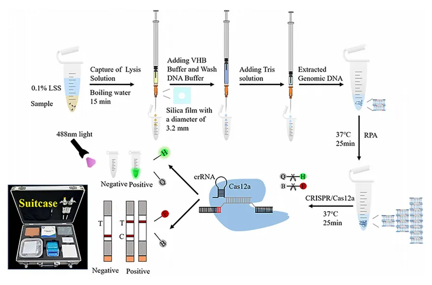 ·集成化便携设计:研究配套开发了一个便携式手提箱,集成了从样本采集、快速DNA提取到检测所需的全部冻干试剂和最小化设备(如移液器、恒温金属浴),实现了“一站式”现场检测。