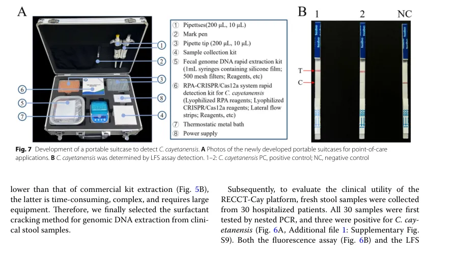 3.配套开发: 设计并开发了一个便携式手提箱,集成了从样本采集、快速粪便DNA提取到RECCT-Cay检测所需的全部试剂(包括冻干试剂)和最小化设备,实现了“一站式”现场检测。