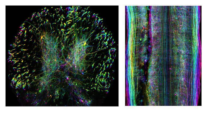 RapiClear 1.49透明处理550um小鼠脊髓切片表达YFP神经元的深度成像显示: