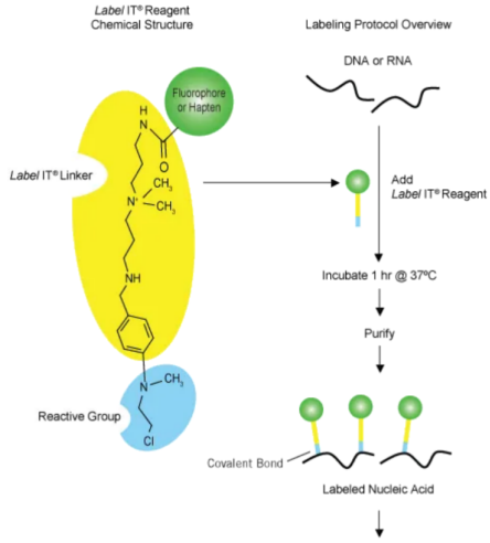 化学标记法:基于结合核酸的反应基团,比如Mirus Label IT® 核酸标记试剂盒属于此类,并且整个反应过程并不需要酶的参与。