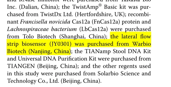其中,使用了沃博生物的产品,CRISPR Cas12/13 HybriDetect试纸条,货号JY0301。